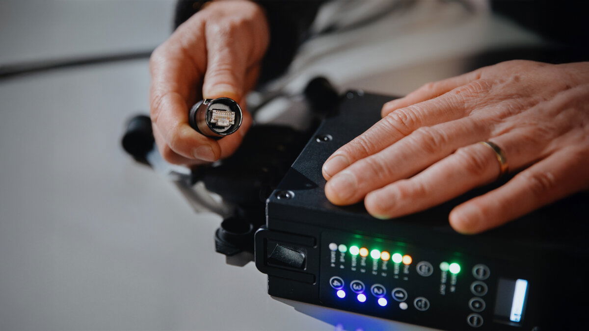 NetBox is designed to work with multiple QuikBeam lights and brings major workflow advantages. Equipped with PrepBox functionality, it adds flexibility and saves valuable time during setup and configuration. Plus, due to its PoE capability, it supports cable runs of up to 100 m and can directly power QuikBeam lights via PoE, with or without a battery inserted. When a battery is inserted, it can be charged while the light is connected. It enables quick setup of Ethernet, DMX, and fixture settings for up to four lights simultaneously.